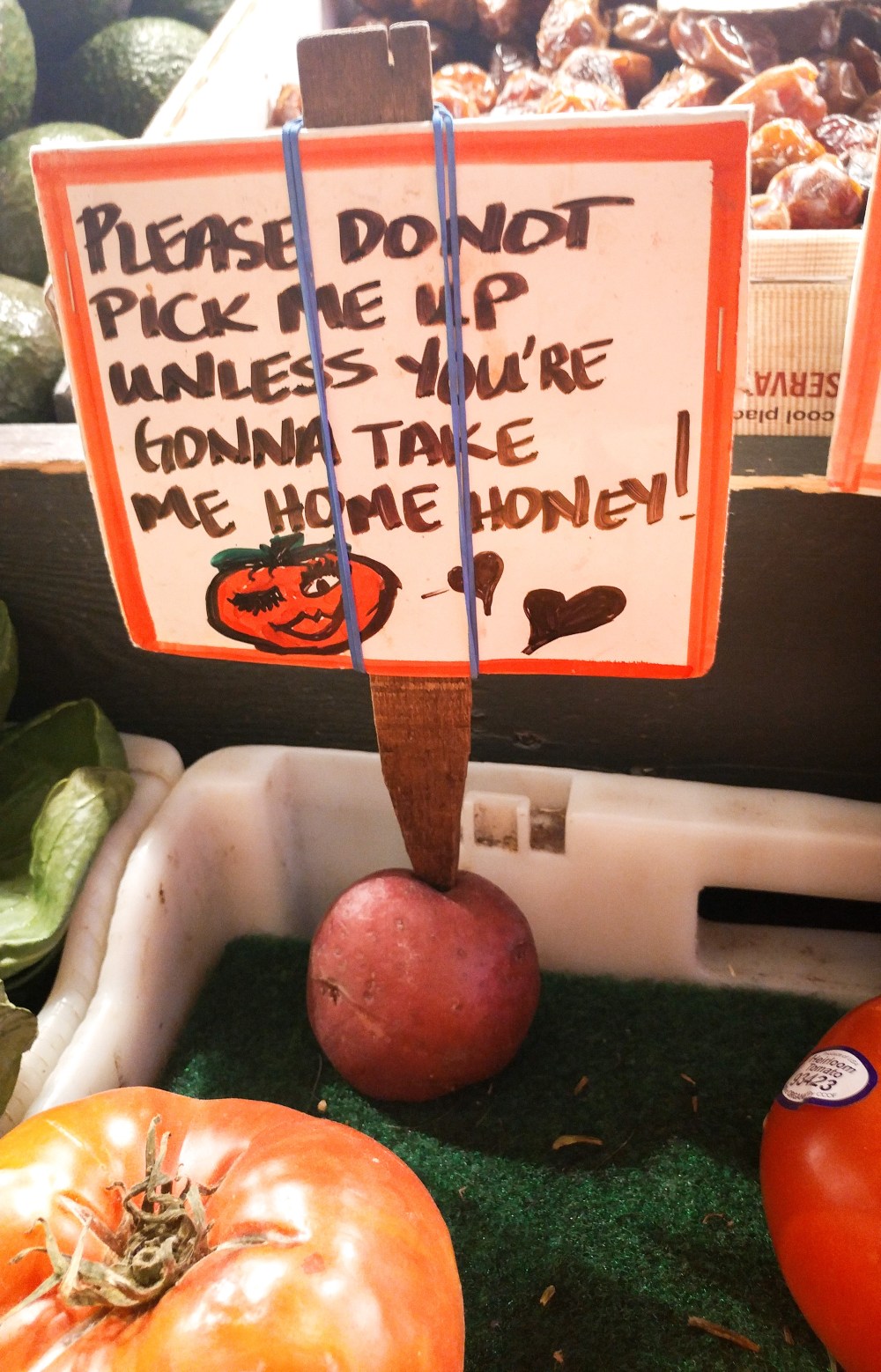 The collection of the available fruits, vegetables and other goods of the ilk, may vary in kind based on accessibility and the import trends of the country. But in essence, the farmers’ markets of the world and the sabzi mandis in India are quite similar – the loud calls of the vendors, an eclectic mix of smells in the air, and gradually moving crowds trying to reach a different stall. What I found quite interesting here were the humorous signboards that accompanied the stock on display (as seen below).
